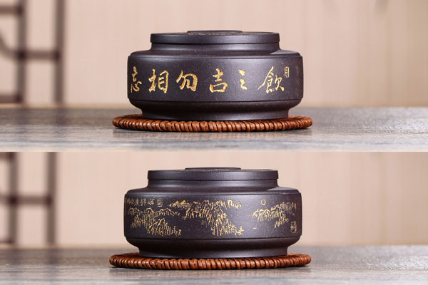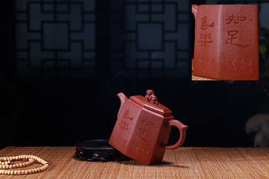 尤其是本人极具品牌特色的作法,善于在茗壶底部镌刻西藏佛教梵文观世音菩萨六字大明咒:“唵嘛呢叭弥吽”。以及镌上嵌有作者名字的《封神演义》集联:“鸿钧一道传三友,壶中妙法贯须弥”,以澄明宁静的禅心逸态广积善缘,超然物外,增长智慧!